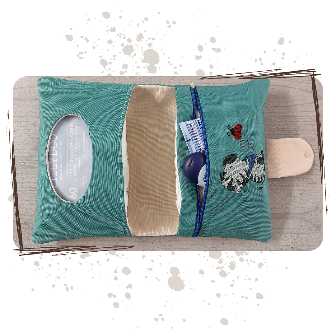 Es bietet einer Feuchttücherpackung mit 60 Tüchern, 3-4 Windeln (getestet in der Windelgr. 5) und flachen Cremes einen Platz. So hat man immer alles dabei. Durch den unempfindlichen Stoff ist es auch nicht schlimm, wenn mal etwas daneben geht.